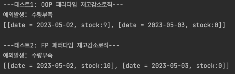 함수형 프로그래밍 방식을 적용한 reserveFP() 메서드는 데이터를 수정하지 않고, stock - 1 값을 반환합니다. stockOOP(1) 데이터를 처리하는 과정에서 예외를 뱉어내며 메서드가 종료됩니다. 결과적으로 try문 내의 reserveFP() 메서드가 실패하고 기존 데이터가 유지됩니다.