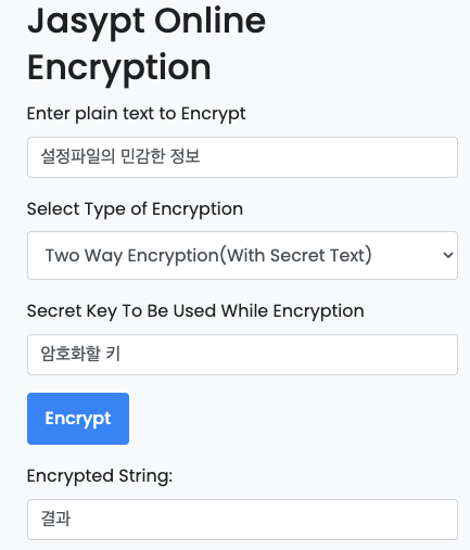 설정 파일의 민감한 정보를 Jasypt Online(https://www.devglan.com/online-tools/jasypt-online-encryption-decryption)에서 간편하게 암호화할 수 있습니다. 그림3을 참조해 설정파일의 값들을 암호한 후, 설정파일의 값들을 수정합니다. 단, ENC() 블록으로 감싸서 암호화된 값임을 애플리케이션이 알 수 있도록 해야합니다.