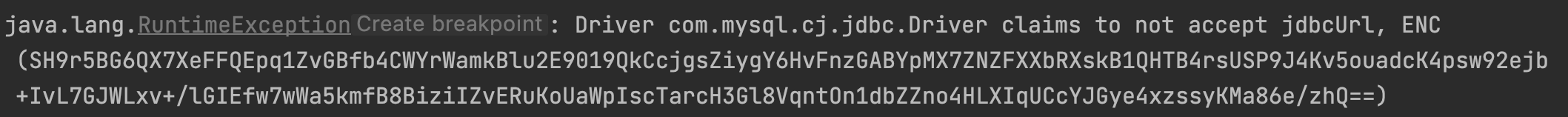 @EnableEncryptableProperties 은 Jasypt 라이브러리가 제공하는 애노테이션입니다. 이 애노테이션이 붙은 클래스가 암호화된 proerties 를 복호화하는 클래스임을 정의하는 애노테이션입니다. 만약 이 애노테이션을 붙이지 않는다면, 애플리케이션이 시작할 때 암호화된 preperties를 복화하지 않고 그대로 읽어들이게 됩니다. 저는 이부분을 깜빡 놓쳐서 애플리케이션이 암호화된 jdbcUrl에 접속하려고 시도하는 바람에 RuntimeException이 발생했습니다. 복호화 클래스 앞에@EnableEncryptableProperties을 꼭 붙이시길 바랍니다.