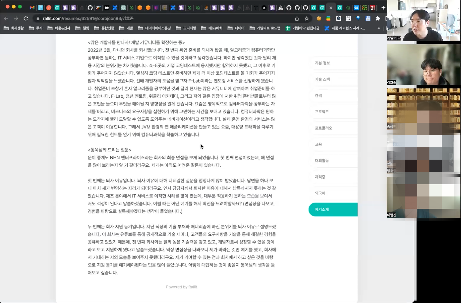 2023년 6월 3일 Zoom 화상 미팅으로 멘토링이 진행됐습니다. 이동욱 멘토님과 4명의 멘티들이 참여했습니다. 멘티들의 이력서와 최근 고민거리를 바탕으로 이야기를 나눴습니다. 이동욱 멘토님은 인프랩의 CTO이시자 면접관으로 활동하고 계시기 때문에, 최근 면접에 대한 고민을 갖고 있는 제게 정말 도움되는 조언을 해주셨습니다.