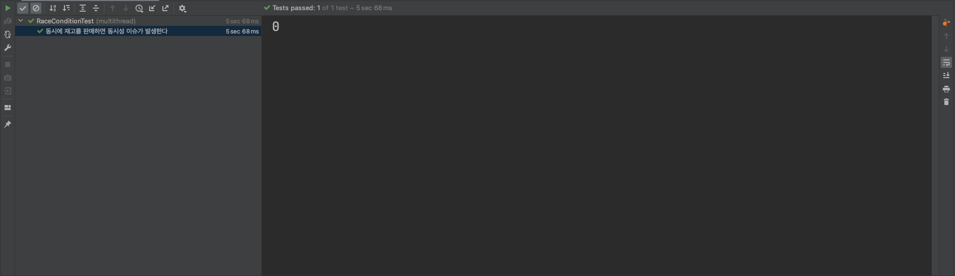 스레드가 minusQunatity() 메서드를 수행하고 있다면, 다른 스레드들은 해당 메서드에 접근할 수 없습니다. 따라서 우리가 기대했던 0이 출력되는 것을 확인할 수 있습니다.
