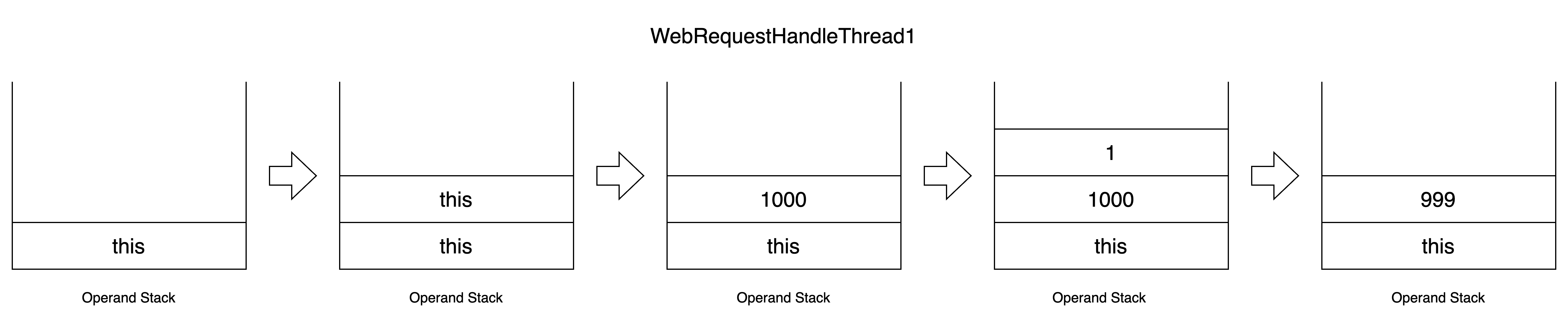 WebRequestHandleThread 기반의 스레드는 바이트코드 1~6번 동작을 수행합니다. 하지만, 1~6번까지의 동작을 연속적으로 한 번에 수행하는 것은 아닙니다. 일부 동작만 수행한 채, 컨텍스트 스위칭이 일어날 수도 있습니다. 이것이 동시성 이슈를 일으키는 원인입니다. 예를 들어, 다음의 과정처럼 동시성 이슈가 일어나게 됩니다.
