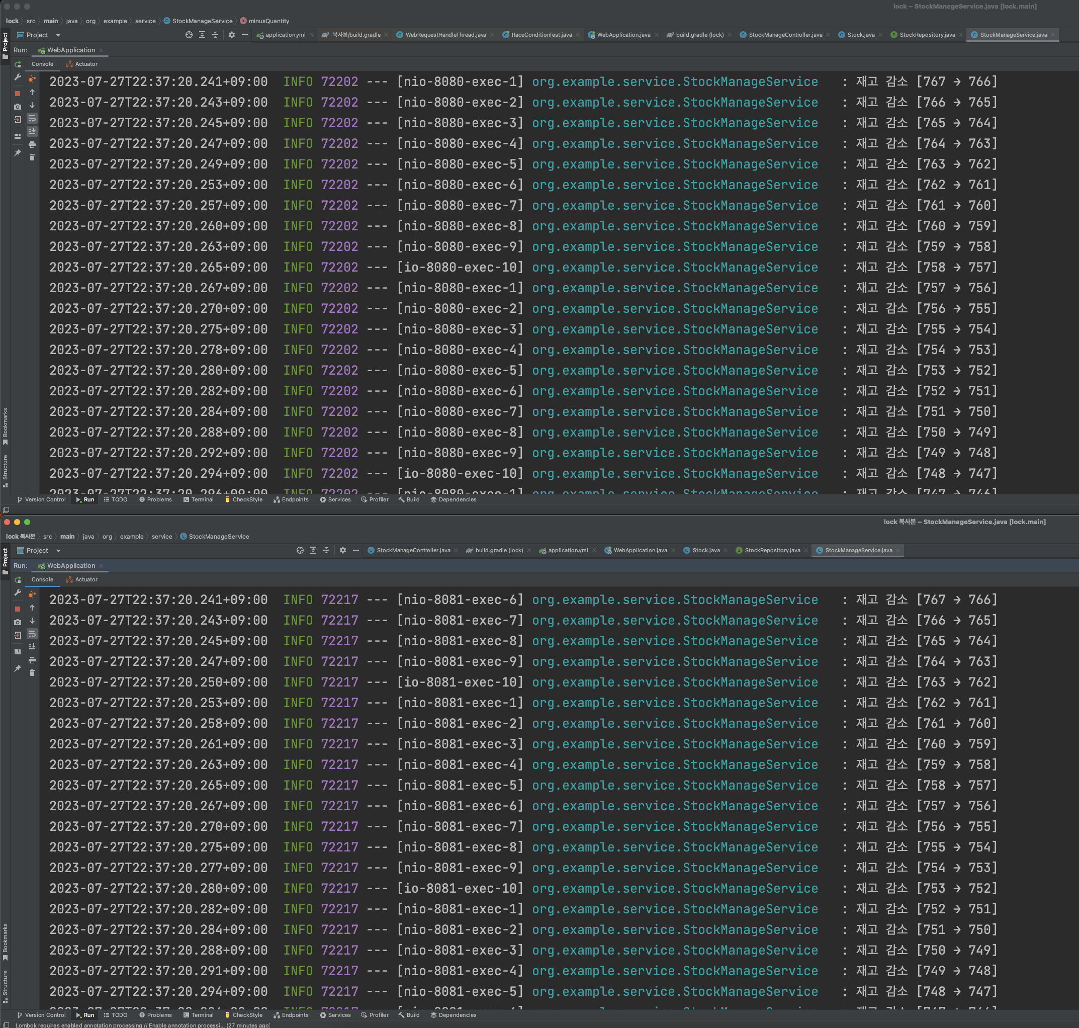 localhost:8080/stock/minus/1x 500번localhost:8081/stock/minus/1x 500번
