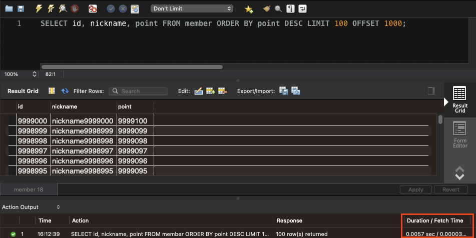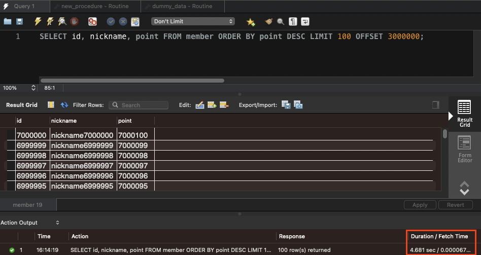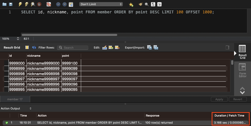 SELECT id, nickname, point FROM member ORDER BY point DESC LIMIT 100 OFFSET 3000000;