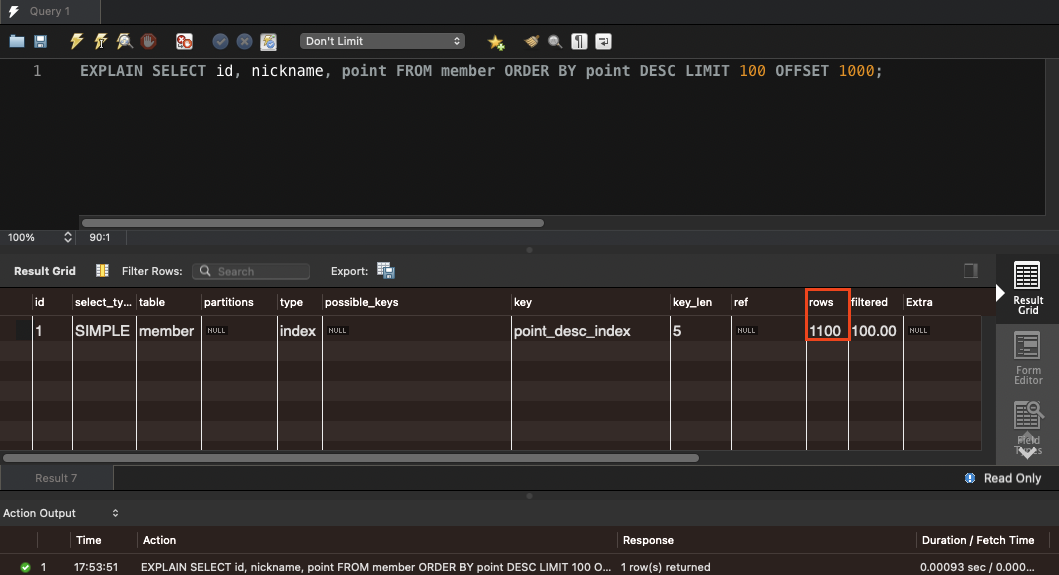 굉장히 빨라졌습니다. 실행계획을 확인해보면 예전처럼 전체 데이터를 스캔하지 않습니다. 1,100개의 행을 스캔하고, 그 중에서 100개의 데이터를 추려냅니다.
