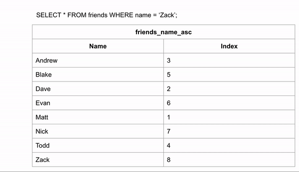 DBMS 인덱스 특징 중 하나는 원하는 내용을 빠르게 찾도록 도와준다는 것입니다. 인덱스를 이분탐색에 활용하여 데이터를 찾기 때문입니다. 그리고 책의 "찾아보기"와 DBMS 인덱스의 공통점 가운데 중요한 것이 바로 정렬입니다. 아래 그림은 인덱스(=friends_name_asc)에서 Name 컬럼이 Zack인 데이터를 찾는 과정을 보여줍니다. Name을 기준으로 정렬된 것을 확인할 수 있습니다.