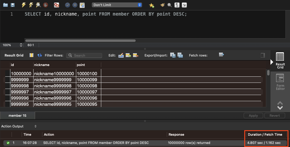 만약 데이터가 많아지면 어떻게 될까요? 1,000만 건의 데이터를 준비하고 실행해봤습니다. 4.807초가 소요됐습니다.