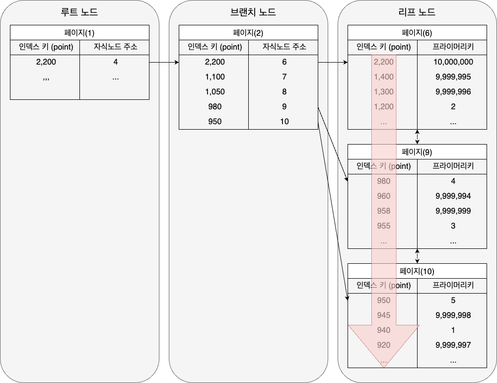 point 컬럼을 인덱스 키로 설정하였습니다. 따라서 인덱스의 리프노드는 point 컬럼을 기준으로 내림차순 정렬됩니다. 인덱스 자체가 이미 정렬되어 있기 때문에 별도의 정렬 작업 없이 읽기만 하면 됩니다.