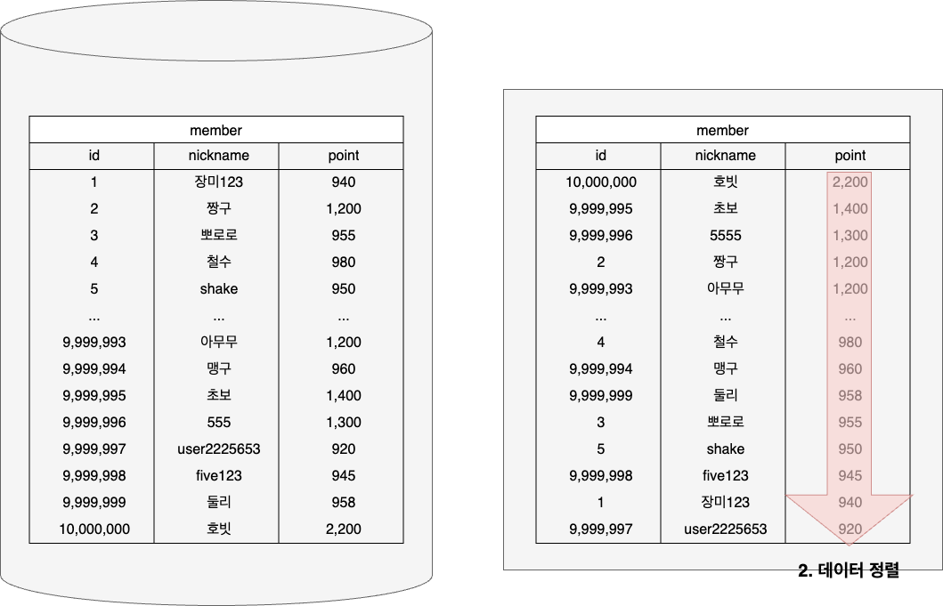 - 서버는 인덱스에서 point 컬럼이 큰 순서대로 원하는 갯수만큼 읽어들이는 쿼리를 수행합니다.
