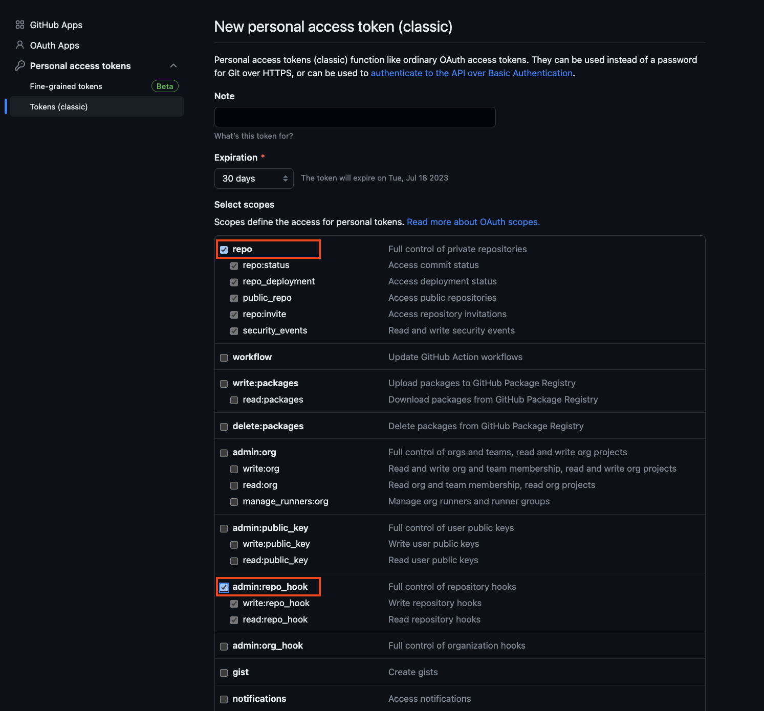GitHub 홈페이지 프로필 사진 → Settings → Developer Settings → Personal access tokens → Tokens(classic) 순서로 클릭하여 GitHub Personal Access Tokens(Classic) 페이지로 이동합니다. Generate new token 버튼을 눌러 Classic Token 생성을 요청합니다. 발급된 토큰은 미리 저장해둡니다. 미리 저장해두지 않으면 일정 시간이 흐른 뒤 확인이 불가능합니다.