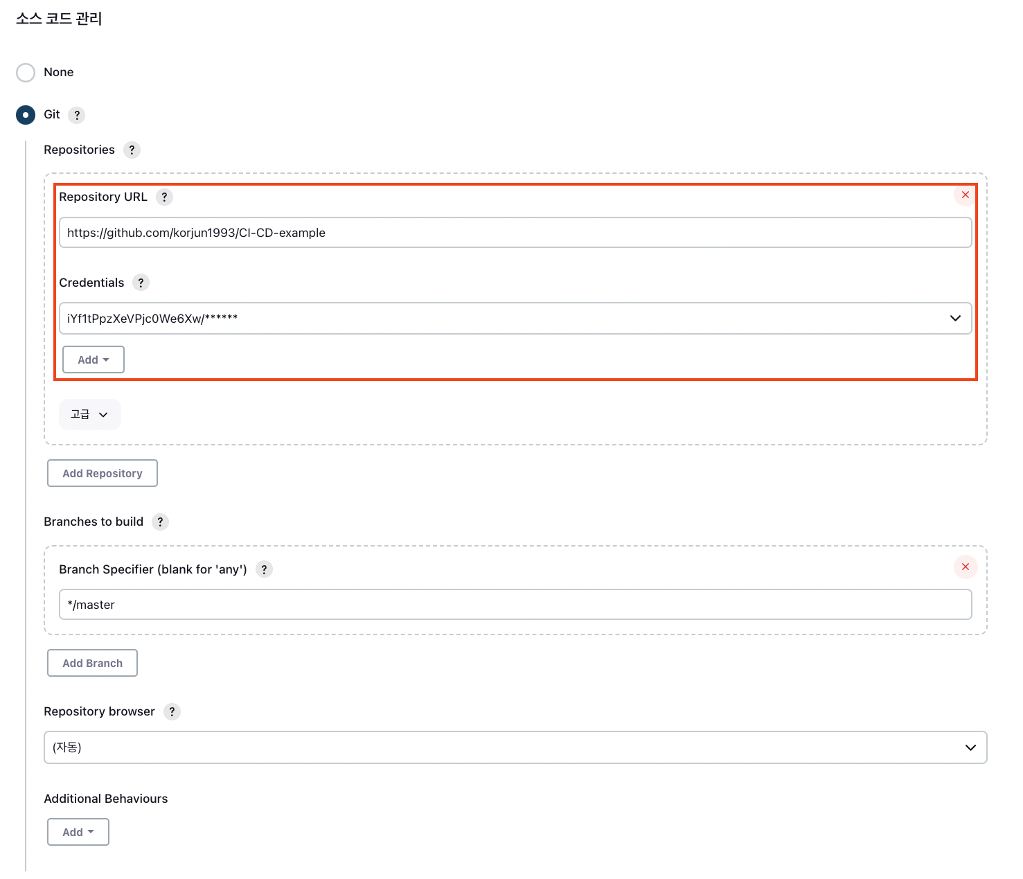 3-2. 소스 코드 관리를 None → Git 으로 변경해주고, 세부 내용을 입력해줍니다.