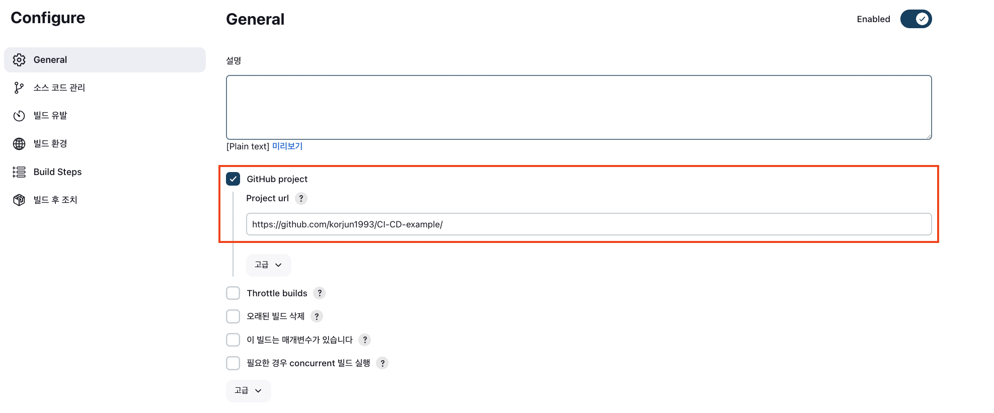 3-1. General 카테고리에서 GitHub project 체크박스를 선택하고, 프로젝트 URL을 입력합니다.