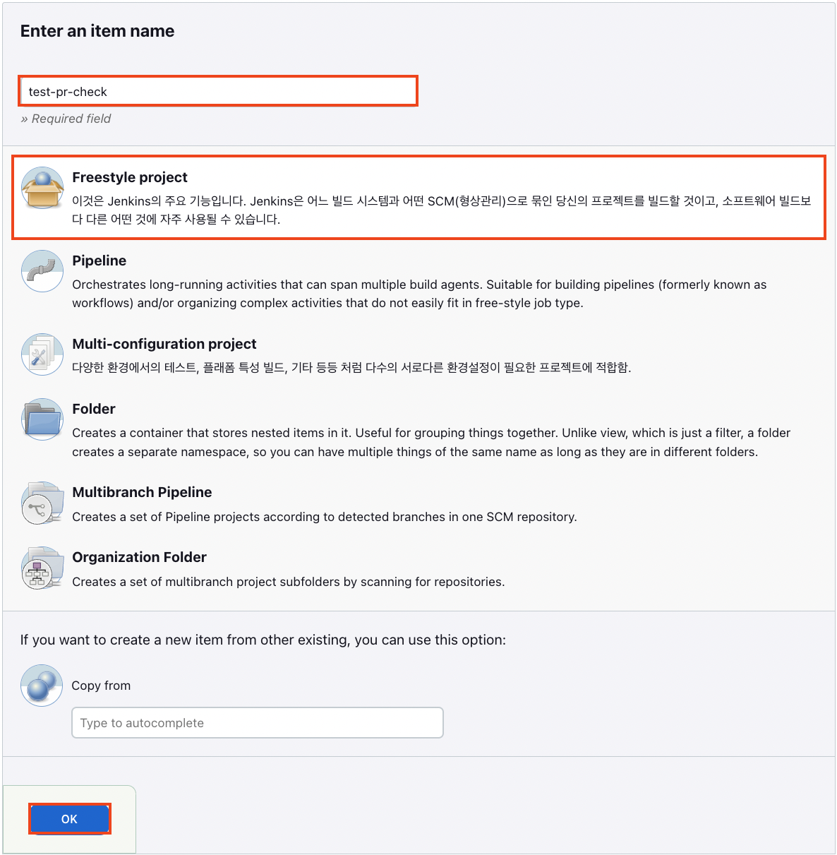"새로운 Item" 버튼을 클릭하고 Item 이름을 입력한 뒤, Freestyle project를 선택해줍니다.